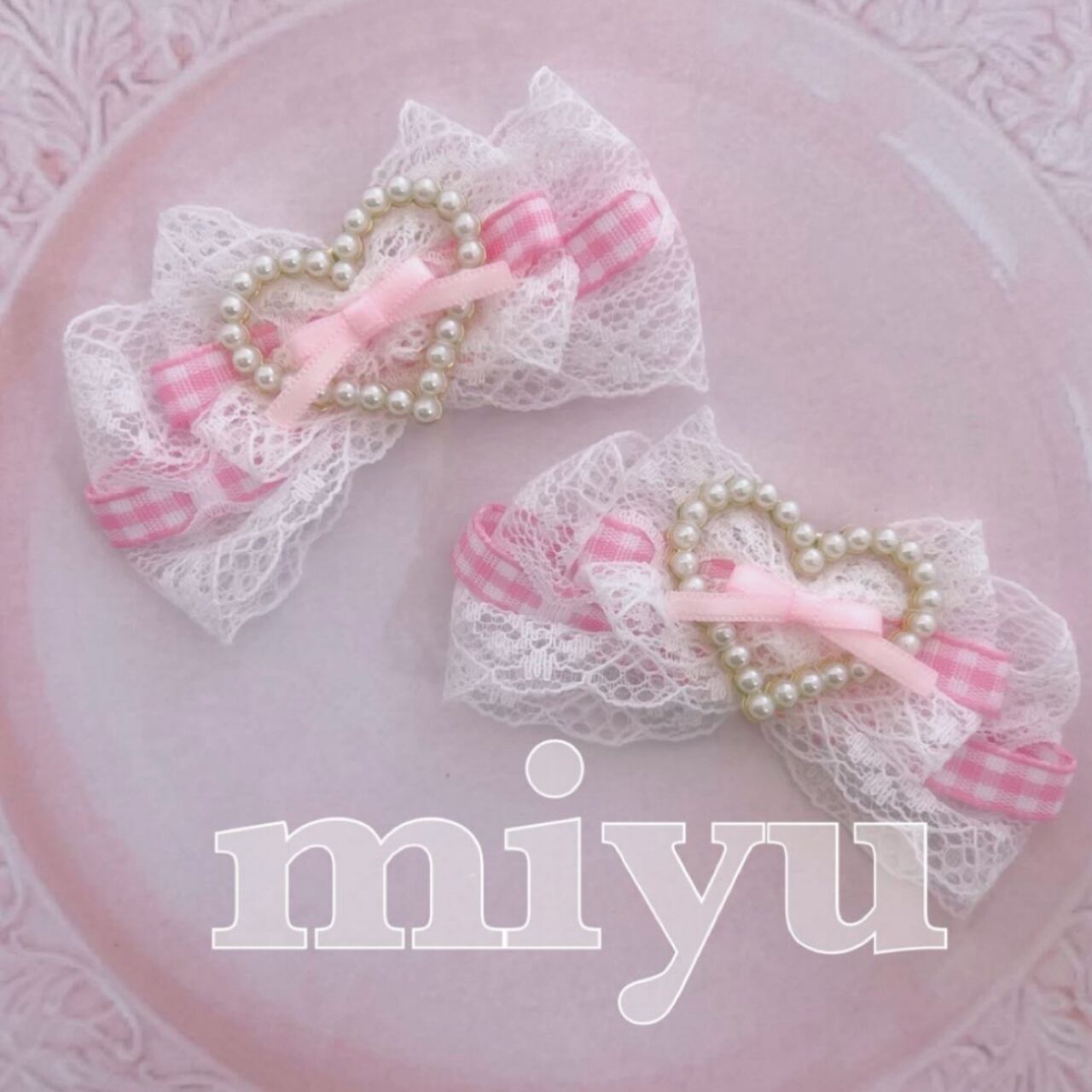 ヘアクリップ(スウィートハート♡レース♡チェックピンク)ロリータ ヘアメ 推し