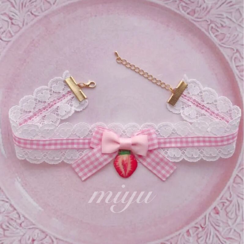♡⑅*。゜ハートのレース&チェックりぼんと美味しそうなイチゴチャーム付のケーキみたいなチョーカーです♡
