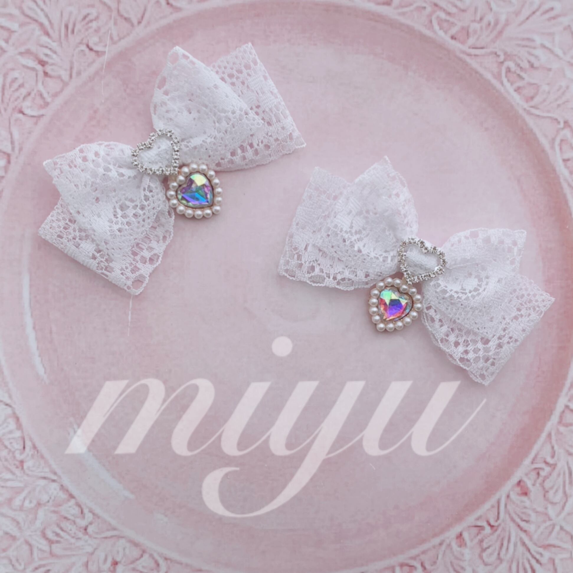レースリボンのダブルハートチャーム付きヘアクリップですପ(꒪o̴̶̷̤ ̫ o̴̶̷̤꒪)ଓ.:*♡໒꒱˚.*♡.。º*